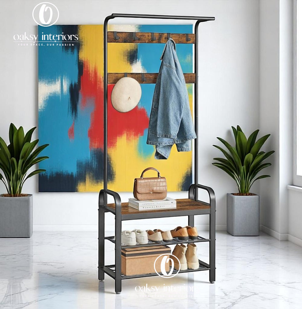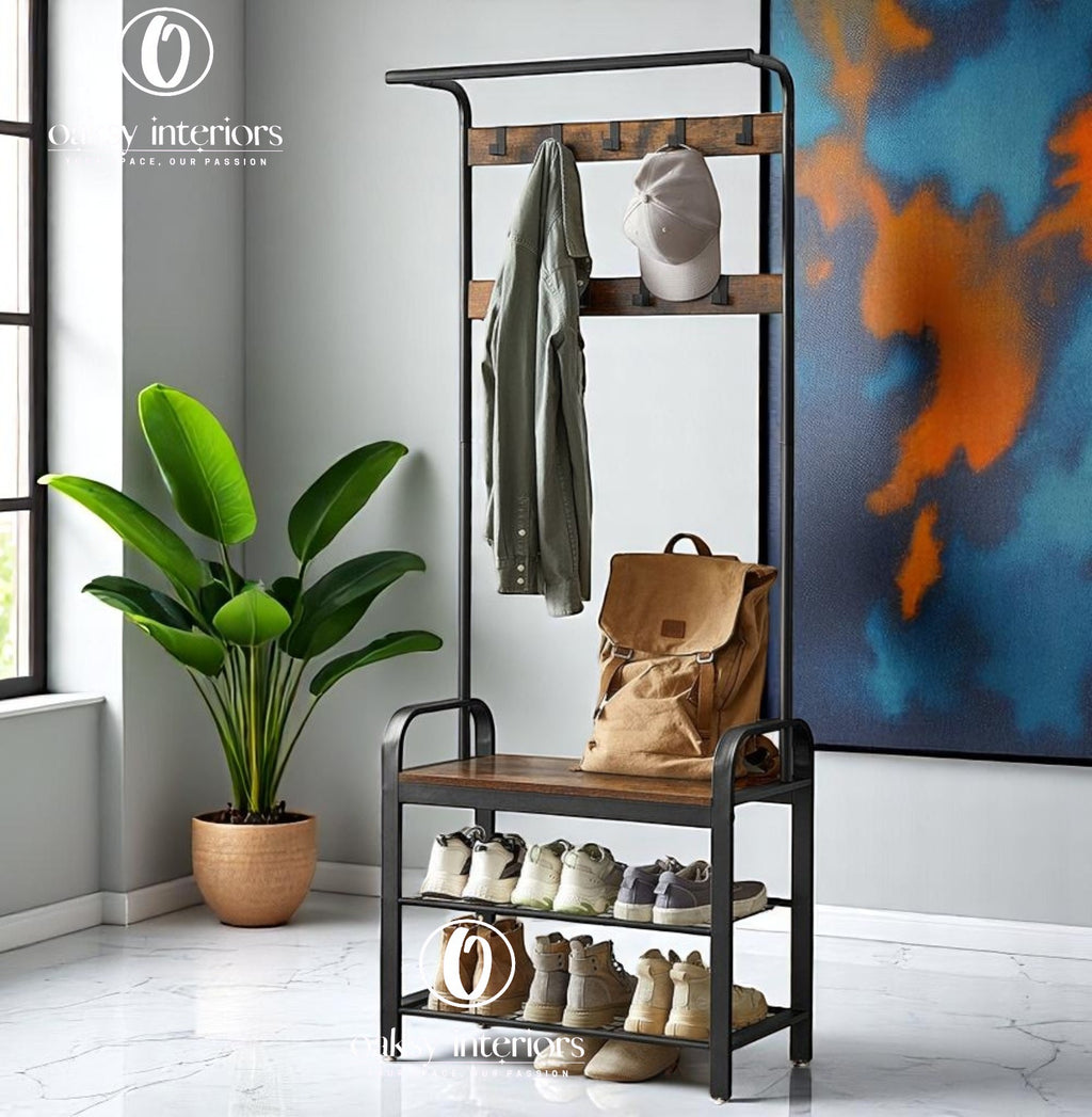 Add a touch of vintage charm and industrial style to your entryway with this beautifully designed coat and shoe rack.